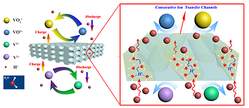 在本工作中,该团队在前期研究基础上,通过在多孔离子传导膜内构建连续的离子传输通道,在保证离子选择性的基础上,大大提高了膜的质子传导性,为高功率密度液流电池的研究开发奠定了基础。相关结果发表在《纳米能源》(Nano Energy)上。