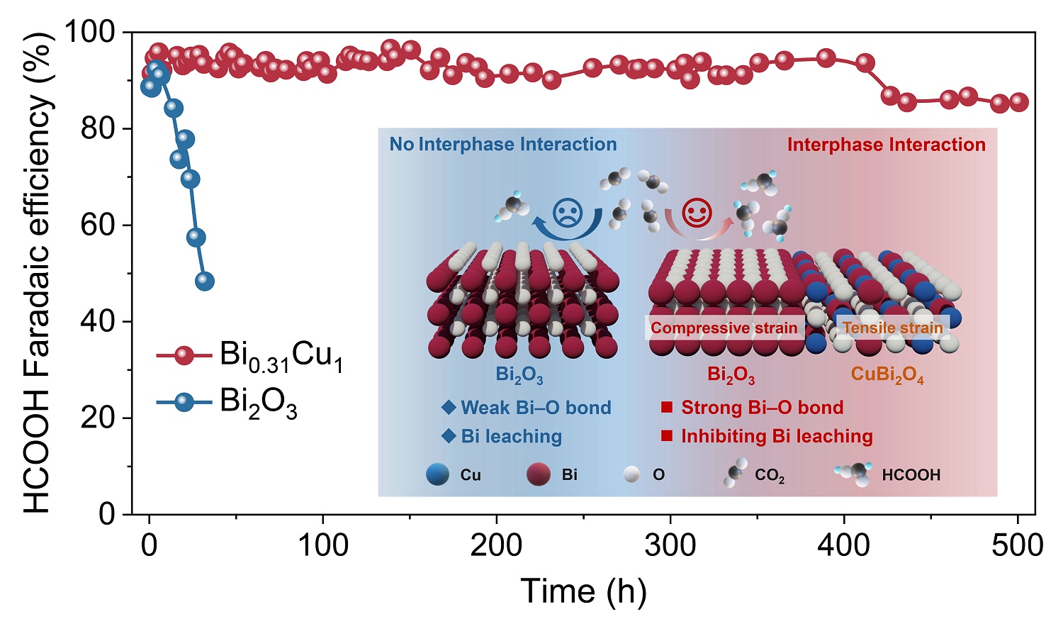在本工作中,合作团队提出了一种金属相保护策略,开发出具有优异酸性二氧化碳电催化还原活性和稳定性的铋-铜(Bi-Cu)双金属氧化物催化剂(Bi0.31Cu1)。该催化剂在200至650 mA cm−2的宽电流密度范围内,甲酸法拉第效率达到90%以上;在200 mA cm−2的电流密度下稳定运行500小时,甲酸法拉第效率维持在90%左右。催化剂结构表征和反应机理研究表明,Bi0.31Cu1催化剂中的三氧化二铋(Bi2O3)相与铋酸铜(CuBi2O4)相之间存在强相互作用,导致Bi2O3相产生压缩应变,增强了Bi−O键强度,从而有效抑制了催化剂重构过程中Bi的溶出,提升了Bi基催化剂的长期稳定性。该金属相保护策略的普适性在铋-镁(Bi-Mg)双金属氧化物催化剂体系中得到进一步验证。