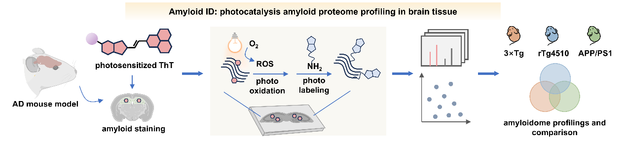 近日,我所蛋白质折叠与聚集研究组(212组)刘宇研究员团队和生物分子高效分离与表征研究组(1810组)张丽华研究员、赵群研究员团队合作,通过对淀粉样变蛋白病理检测工具分子——硫黄素T进行系统性结构改造,实现了阿尔茨海默病小鼠脑组织中淀粉样沉积物的光催化邻近标记,并原位解析了其组成成分和相互作用信息。