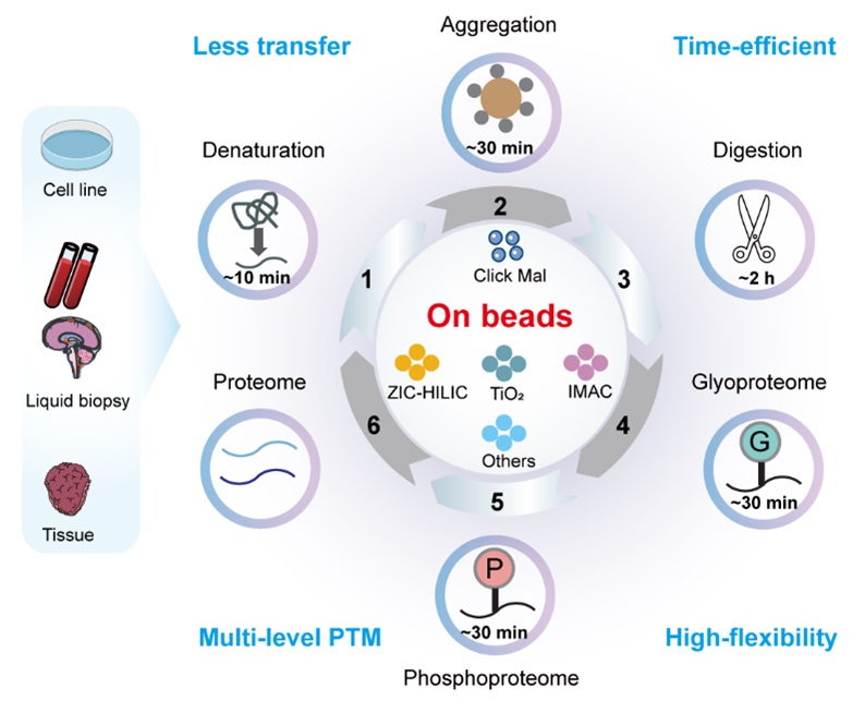 PTMs是调控蛋白质功能的核心机制,其中,糖基化与磷酸化更是参与细胞信号传导、疾病发生的关键过程。然而,传统多PTMs分析需平行处理多个样本,不仅存在操作繁琐、耗时久(约32 小时)、样本损失大等问题,还难以捕捉不同PTMs间的调控关联,制约了多组学研究的深度与可靠性。