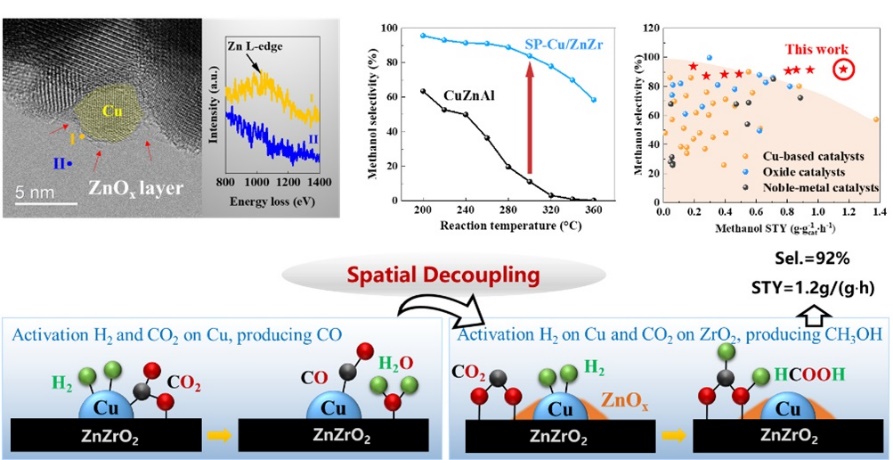 孙剑研究团队长期致力于二氧化碳加氢转化的亚稳态催化材料的开发(Angew. Chem., Int. Ed.,2023;Angew. Chem., Int. Ed.,2024;Nat. Chem.,2024;Appl. Catal. B: Environ. & Energy,2026)。在前期工作中,团队发现粉末磁控溅射(Sputtering, SP)技术的高能等离子体轰击可改变铜(Cu)原子电子结构(Sci. Adv.,2018),并在Cu纳米颗粒上诱导金属-载体强相互作用(SMSI)(Nat. Commun.,2021)。基于上述研究基础,在本工作中,团队利用SMSI驱动所形成的包覆层结构对活性位点进行“空间解耦”,将CO2活化位点与H2解离位点在空间上分离,使CO2优先在二氧化锆(ZrO2)上吸附活化,并遵循“甲酸盐”路径合成甲醇。与Cu位点上CO2的活化方式(先断C=O键后加氢)不同,该设计巧妙地利用ZrO2位点上先加氢后断C=O键的活化方式,抑制了副产物CO的生成,同时保留了Cu位点高效的H2解离能力。该CuZnZr催化剂在300℃、3MPa的反应条件下,甲醇选择性为92%,甲醇时空收率达到1.2 g·gcat-1·h-1,是现有商业铜锌铝催化剂的3倍。本工作通过重塑催化剂的表面结构,改变反应物的吸附解离方式及反应路径,打破了活性与选择性的“跷跷板”限制,为多功能催化剂的精准设计提供了新思路。