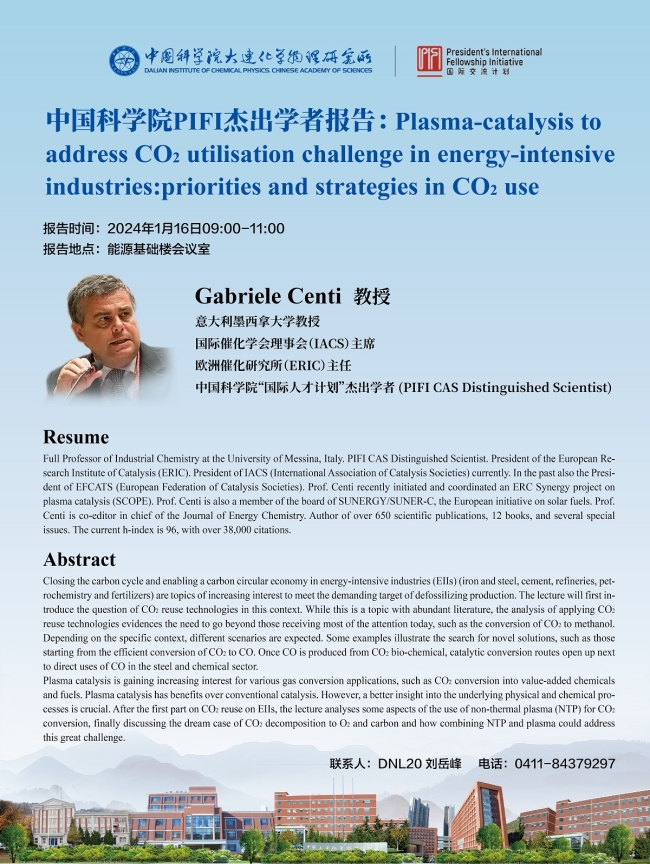 关于举行中国科学院PIFI杰出学者报告:Plasma-catalysis to address CO2 utilisation challenge in energy-intensive industries: priorities and strategies in CO2 use的通知