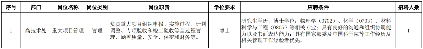 中国科学院大连化学物理研究所本着“按需设岗、公开招聘、竞争上岗、择优聘用”的原则,根据《大连化物所事业编制工作人员招聘实施细则(试行)》有关要求,现面向社会公开招聘职能部门工作人员1名,具体信息如下: