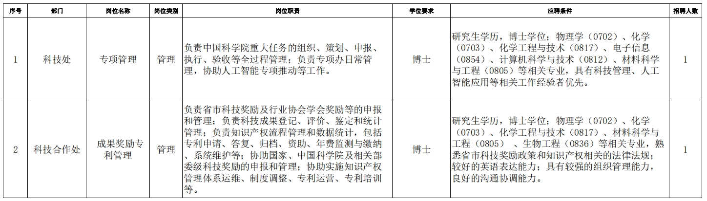 中国科学院大连化学物理研究所本着“按需设岗、公开招聘、竞争上岗、择优聘用”的原则,根据《大连化物所事业编制工作人员招聘实施细则(试行)》有关要求,现面向社会公开招聘职能部门工作人员2名,具体信息如下:
