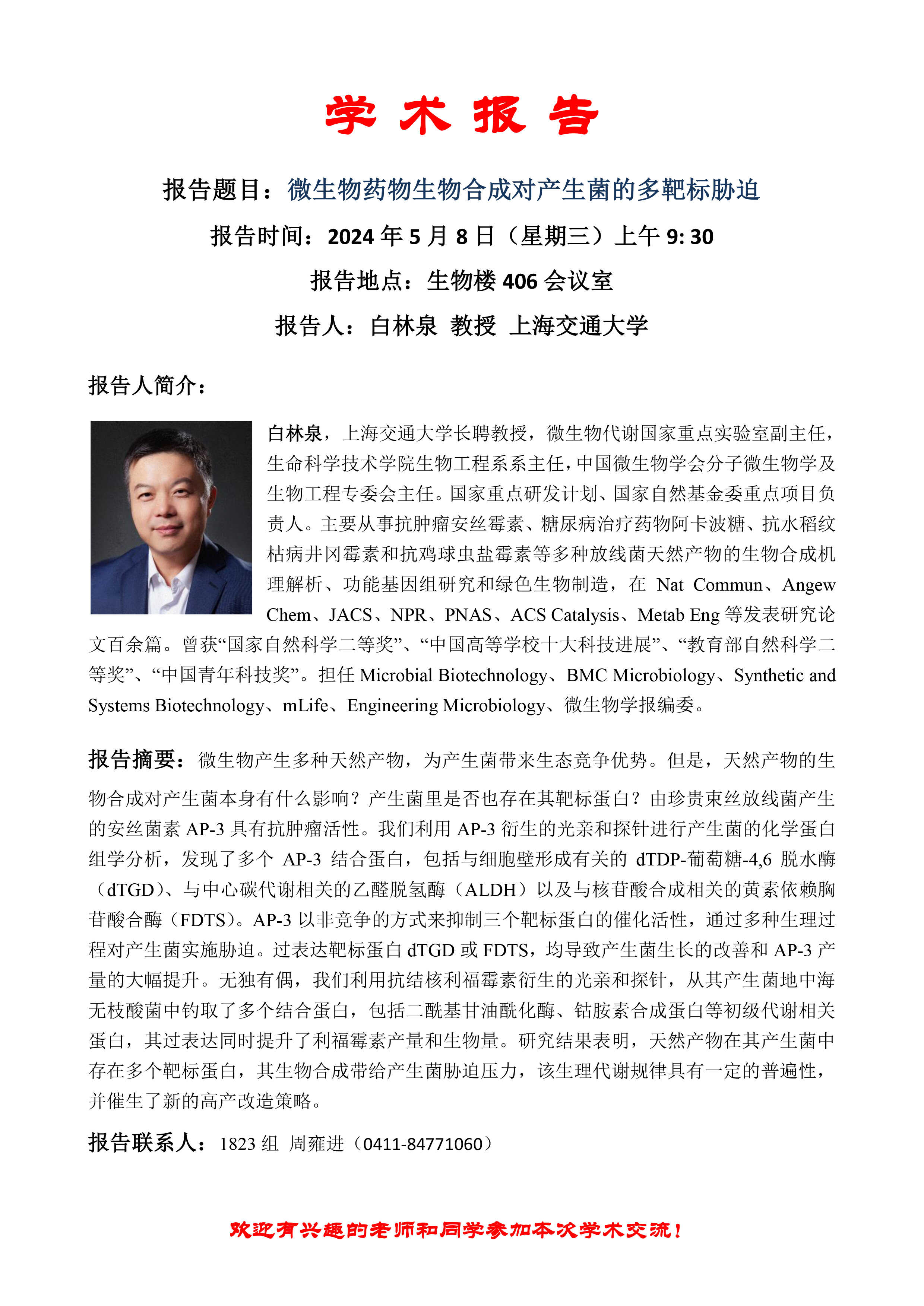 关于举行“微生物药物生物合成对产生菌的多靶标胁迫”学术报告会的通知