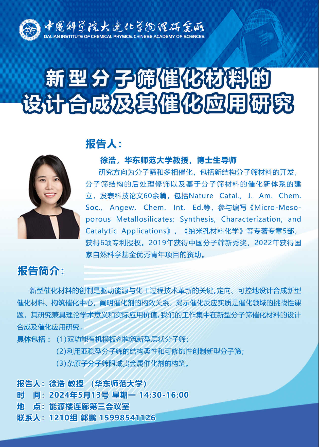 关于举行“新型分子筛催化材料的设计合成及其催化应用研究”学术报告会的通知