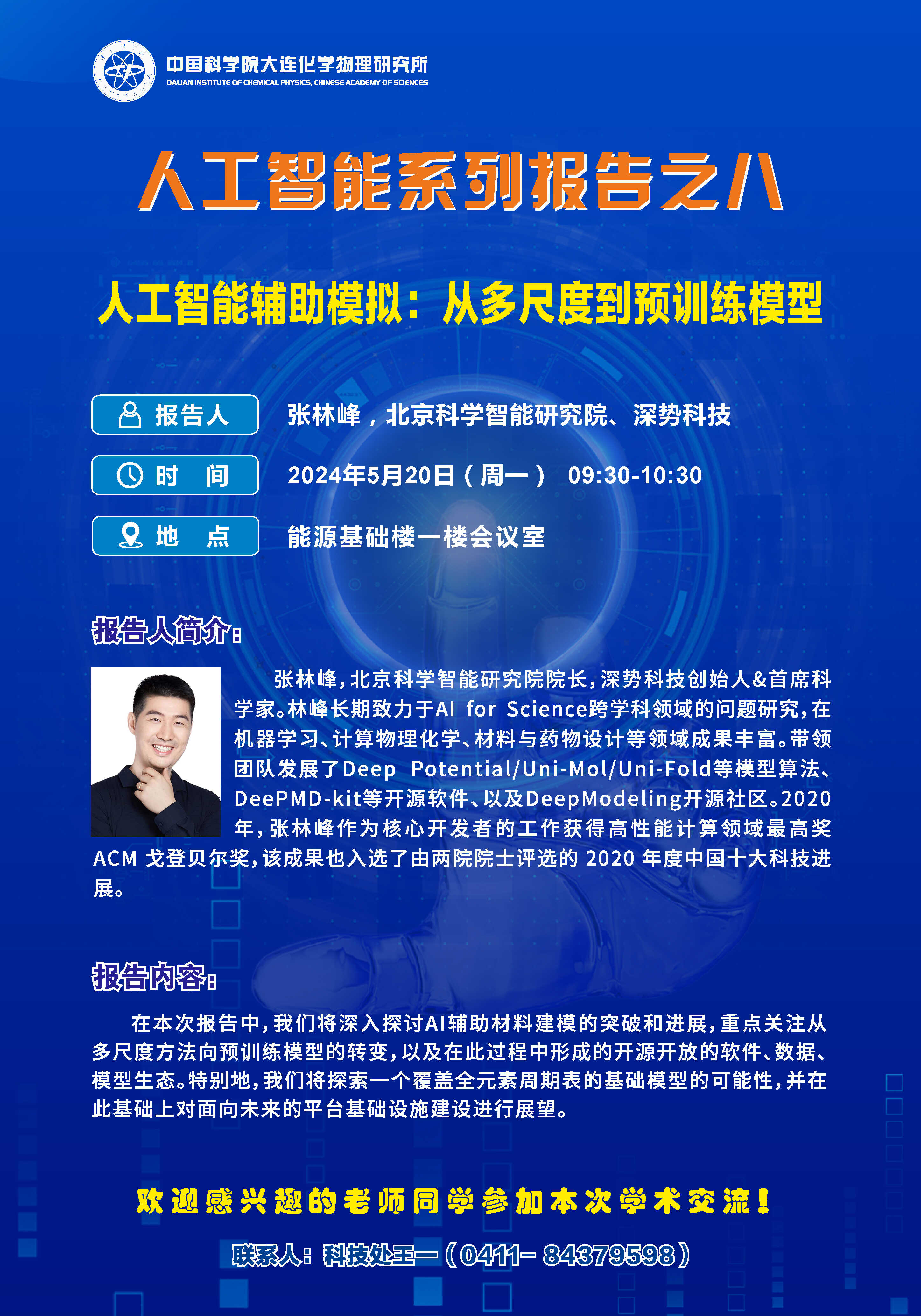 关于举行人工智能系列报告之八——人工智能辅助模拟:从多尺度到预训练模型的通知