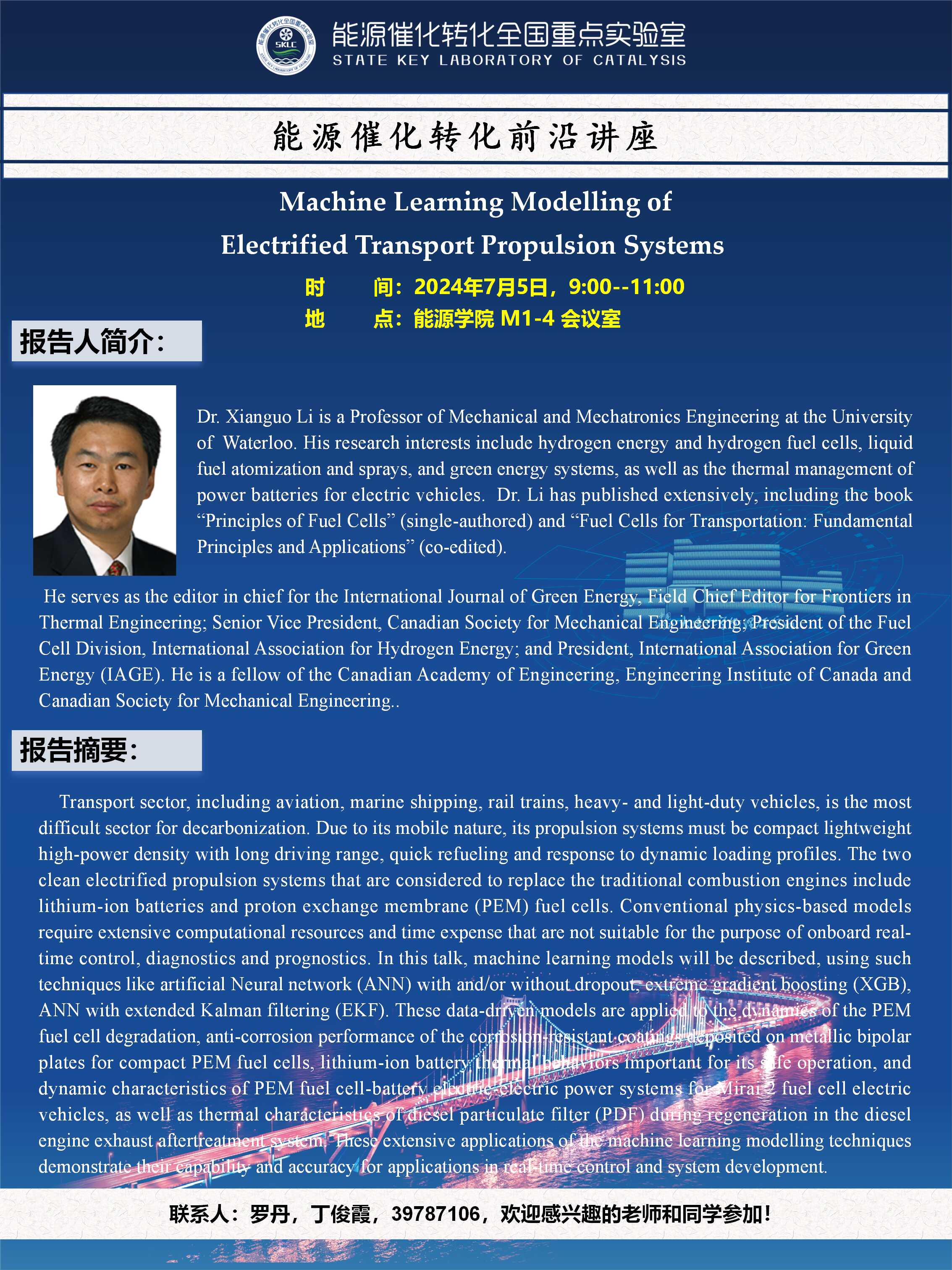 关于举行能源催化转化前沿讲座:Machine Learning Modelling of Electrified Transport Propulsion Systems的通知
