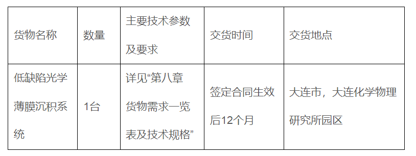 国信国际工程咨询集团股份有限公司(以下简称“招标代理机构”)受招标人委托,就其“中国科学院大连化学物理研究所低缺陷光学薄膜沉积系统采购项目”进行国际公开招标,现邀请合格投标人参加投标。