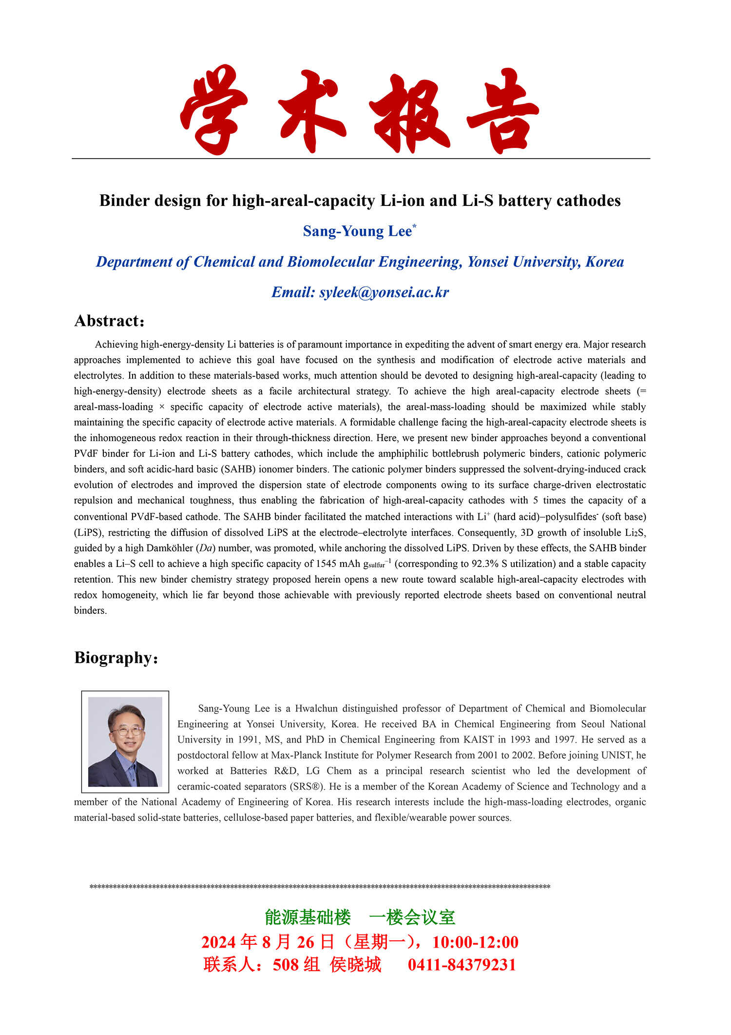 关于举行“Binder design for high-areal-capacity Li-ion and Li-S battery cathodes”学术报告会的通知