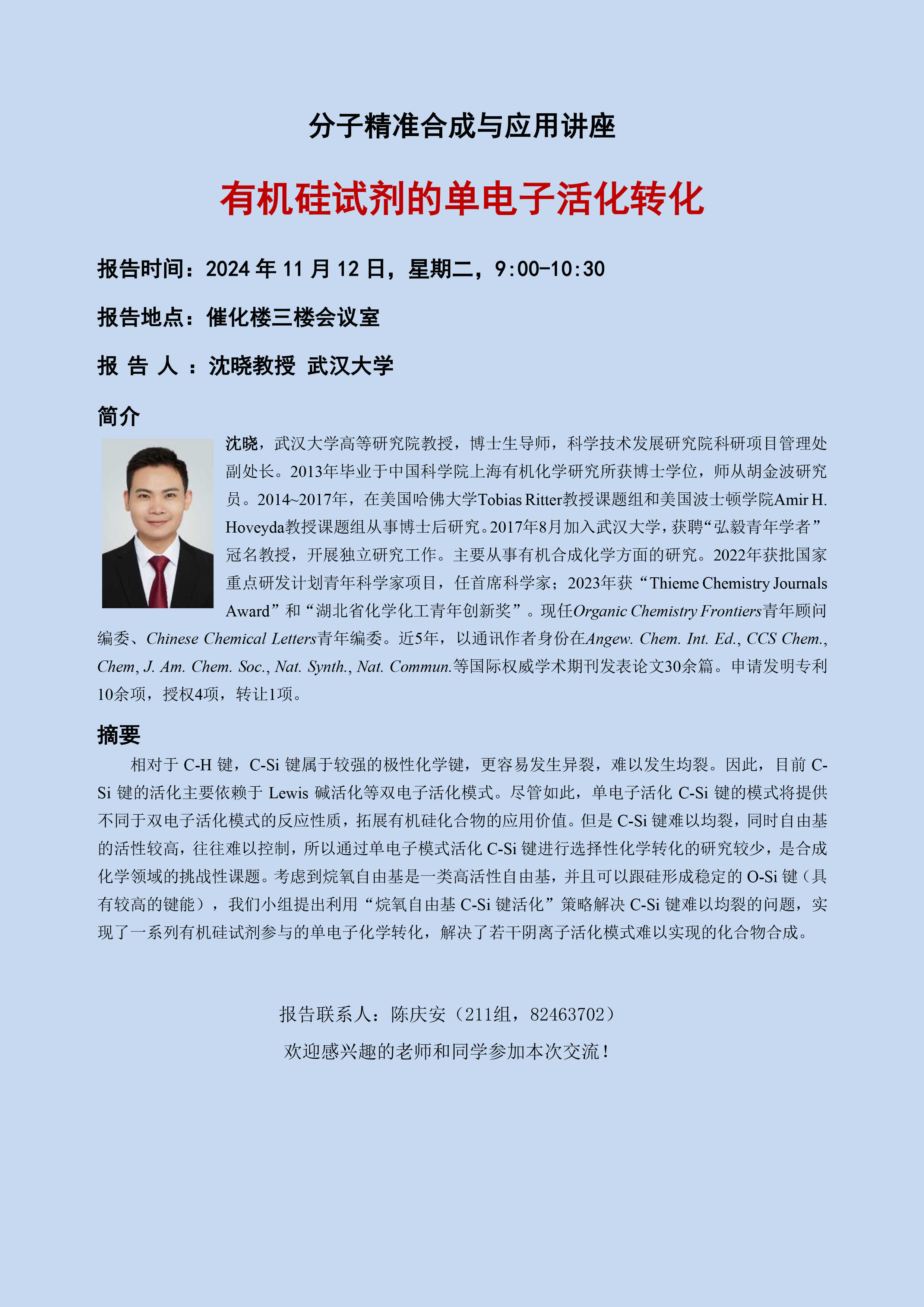 关于举行“有机硅试剂的单电子活化转化”学术报告会的通知