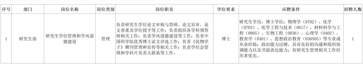 中国科学院大连化学物理研究所本着“按需设岗、公开招聘、竞争上岗、择优聘用”的原则,根据《大连化物所事业编制工作人员招聘实施细则(试行)》有关要求,现面向社会公开招聘职能部门工作人员1名,具体信息如下: