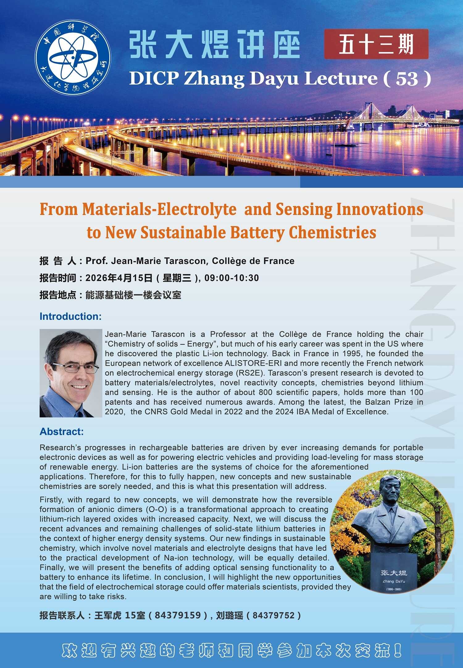 第53期张大煜讲座将于4月15日(星期三)9:00在能源基础楼一楼会议室举行,本次报告人是法国科学院院士、教授Jean-Marie Tarascon(法国法兰西学院),报告主题为“From Materials-Electrolyte and Sensing Innovations to New Sustainable Battery Chemistries”。欢迎参加!