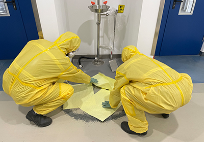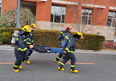 本次演练以某房间危废泄漏导致意外起火为模拟背景,疏散过程中突发一人乘坐电梯被困情况。演练过程由金玉奇下达命令,消防、应急、救援、安保等各应急岗位人员按照演练方案、处置流程完成本次演练。