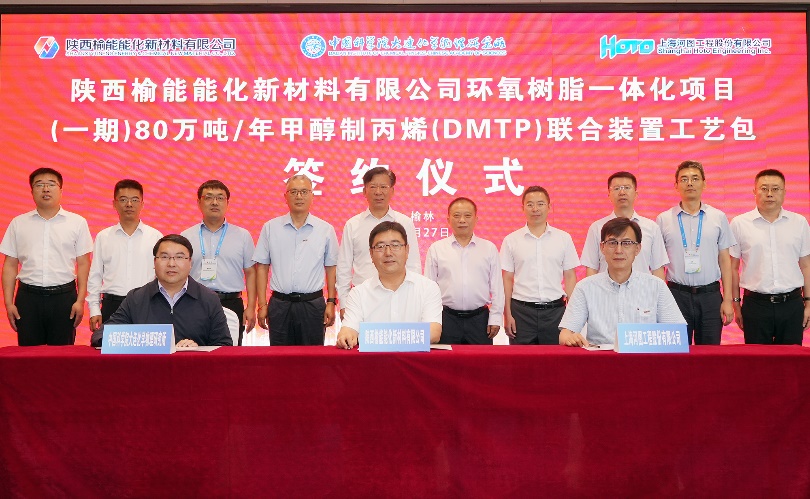 7月27日,我所与陕西榆能能化新材料有限公司(以下简称“榆能能化”)、上海河图工程股份有限公司(以下简称“上海河图”)在榆林举行榆能能化环氧树脂一体化项目(一期)80万吨/年甲醇制丙烯联合装置工艺包签约仪式。