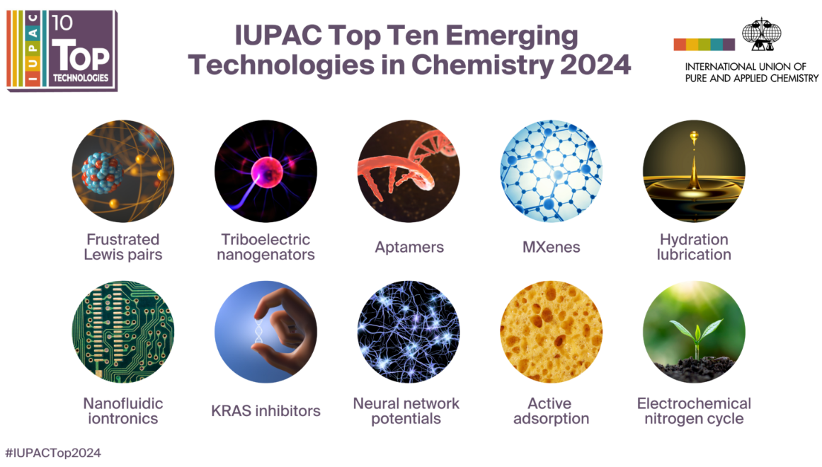 “化学领域十大新兴技术”主要聚焦联合国可持续发展目标,遴选出十项全球化学科学领域中最具潜力的新兴技术。2024年度入选的新兴技术为:Frustrated Lewis pairs(受阻路易斯对)、Triboelectric nanogenerators(摩擦电纳米发电机)、Aptamers(适配体)、MXenes(二维过渡金属碳/氮化物)、Hydration lubrication(水合润滑)、Bioinspired nanofluidic iontronics(仿生纳流离子学)、KRAS inhibitors(KRAS抑制剂)、Neural network potentials(神经网络势)、Active adsorption(主动吸附)、Electrochemical nitrogen cycle(电化学氮循环)。