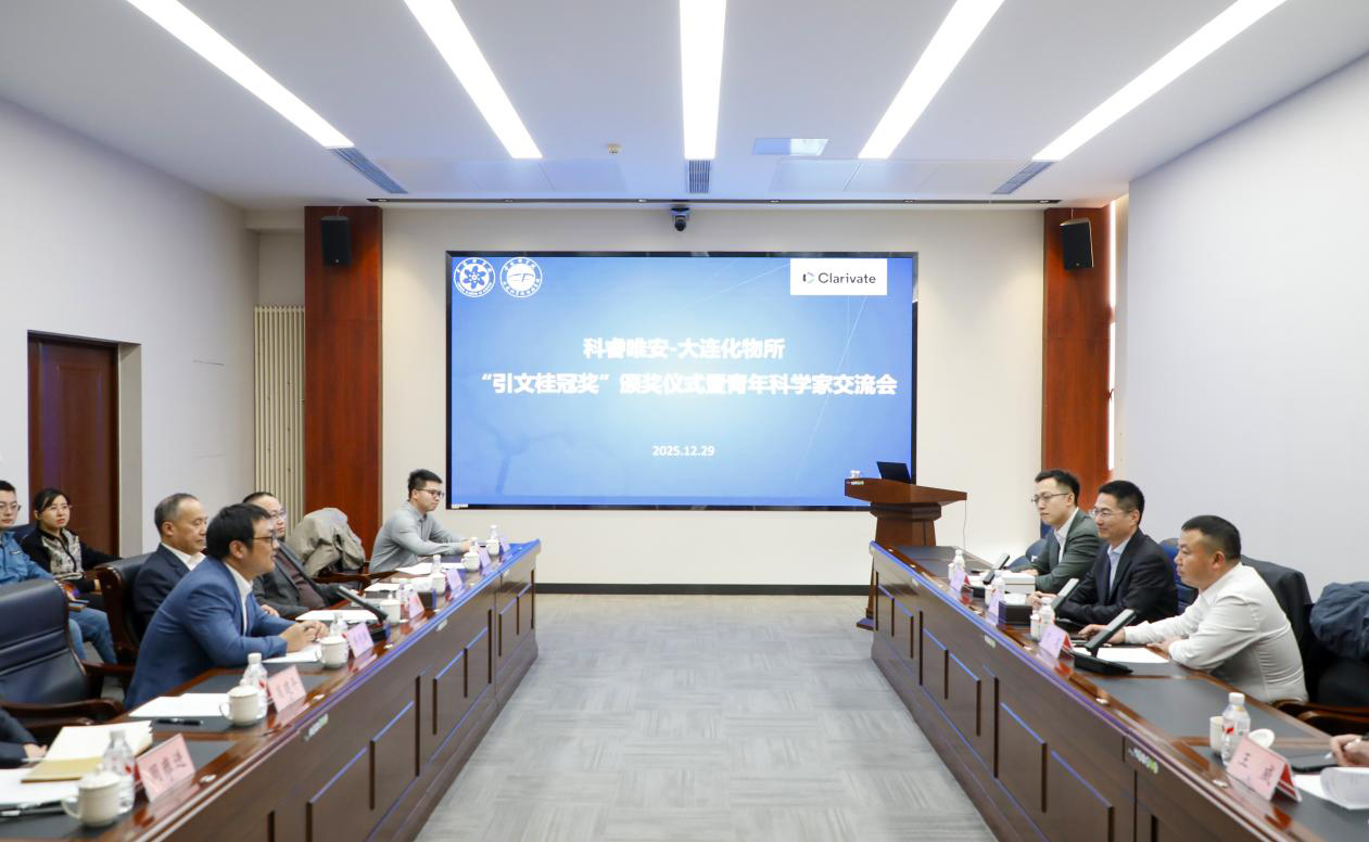 李先锋详细介绍了我所科研进展、期刊建设等基本情况,他表示,当前世界科技革命与产业变革深入发展,科学研究范式正在发生深刻变革,我所将继续坚持“四个面向”的战略指引,推动基础与应用研究不断取得新突破。张涛表示,感谢科睿唯安对单原子催化研究领域的关注,希望通过此次交流加强双方在科研数据、信息分析等方面的合作,共同推动单原子催化研究迈向新高度。王利表示,科睿唯安长期关注全球科研动态,特别是大连化物所在科研领域取得的科研进展,希望双方进一步加强合作与交流,共同探索科研新方向,为推动全球科技进步贡献力量。会上,王利为我所颁发了“引文桂冠奖”。