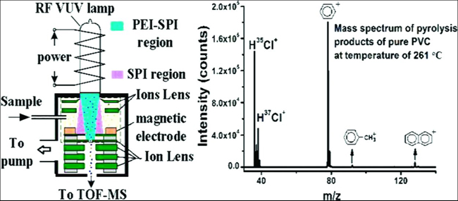我所李海洋研究员领导的团队基于光电效应,利用商用的射频VUV灯作为光源,成功研制了一种可以快速切换的高效的新型磁场增强的光电子碰撞电离(MEPEI)和单光子电离(SPI)复合电离源。将该复合电离源与飞行时间质谱结合,实现了对难电离的无机化合物进行了分析检测,产物离子无碎片,便于复杂样品的谱图解析。实验结果表明,利用800G的永久磁铁,可以使SO2、SF6、O2和N2的离子信号强度增加2个量级;同时对SPI的电离源的电离效率提高了2-3个量级。对苯和SO2的检测灵敏度为80 ppbv和750 ppbv;用该电离源实现了复杂混合无机物的在线监测,并成功用于PVC热裂解产物的在线分析、高压绝缘开关中SF6放电过程中的中间产物分析。另外,该电离源在在线分析复杂的二噁英前生体方面具有广阔的应用前景。该成果已经刊登在美国化学会(Analytical Chemistry)上(http://pubs.acs.org/doi/pdfplus/10.1021/ac201791n)。