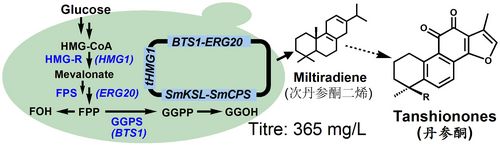 在杨胜利院士建议下,我所赵宗保研究员与黄璐琦研究员合作,以丹参酮为目标,开展合成生物学理念指导下的萜类化合物异源生物合成研究。科研人员建立了“模块途径工程”策略,可在酵母细胞中快速组装代谢途径。在此基础上,通过设计模块组合方式,系统考虑途径中涉及的前体供给、限速步骤、底物传输和代谢流分配等问题,对编码SmCPS、SmKSL、法呢基焦磷酸合酶、GGPP合酶和甲羟戊酸还原酶等五个蛋白的基因进行了操作,最优的工程菌株在15-L发酵罐中培养,次丹参酮二烯产量达到365mg/L的国际先进水平。