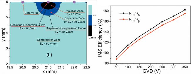 本课题组通过对离子迁移谱的关键部件-Bradbury-Nielsen(BN)型离子门的深入研究,发现强化离子压缩区的特性,可以有效地压缩离子到达探测器的峰宽,提高离子迁移谱的分辨能力,并提出了描述BN离子门斩切行为的三区理论。我们发现:通过提高离子门的关门电压, 离子迁移谱的分辨能力可以达到传统理论预测值180%。