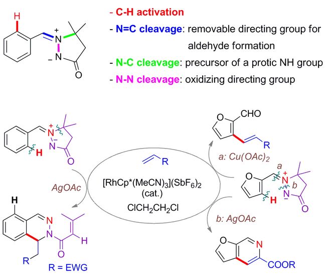 金属催化的C-H键的活化是有效构建C-C,C-N,C-O等化学键的方法,在近二、三十年内得到了迅猛的发展。这些合成方法具有原料简便易得,合成选择性高,反应兼容性好,条件较为温和等特点。在有机合成,药物开发和材料制备等领域得到了广泛的应用。多数情况下,底物(如芳烃)的C-H键活化是需要定位基辅助作用来实现的。因此开发设计功能独特的定位基来合成重要的产物成为金属有机化学和均相催化领域的重要方向之一。02T3组实现了功能多样而独特的亚胺内盐底物的C-H键活化以及同烯烃的氧化偶联,并发现了一系列重要的现象和结果(如底物以及氧化剂控制的不同反应选择性):