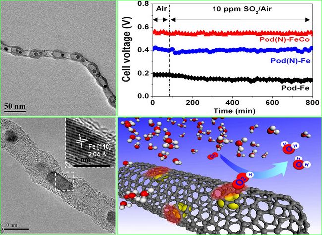 我所催化基础国家重点实验室邓德会博士、潘秀莲研究员、包信和院士等与洁净能源国家实验室燃料电池研究部合作,在对碳纳米管限域效应研究取得系列进展的基础上,努力创新合成制备方法,创造性地将铁基金属纳米粒子限域到具有豆荚状结构(Bean-Pod-Like)的碳纳米管的管腔中,采用该研究组新近研制成功的深紫外光发射电子显微镜(DU-PEEM),并借助上海光源先进的X-射线吸收谱(XAS),结合理论计算,首次观察到金属铁的活性d电子通过与组成碳管壁的碳原子相互作用而“穿过”(Penetrating)碳管管壁,富集在碳管外表面的电子直接催化分子氧的还原反应(ORR)。实验和理论研究进一步证实,在这一体系中,包裹纳米金属铁的碳壁阻断了反应气体与铁纳米粒子的直接接触,从原理上避免了反应过程中活性金属铁纳米粒子的深度氧化,以及反应气氛中其它有害组分对催化剂的中毒,从而在根本上解决了纳米金属铁作为燃料电池阴极催化剂的稳定性难题。进一步对包裹金属纳米粒子的碳壁进行杂原子(如氮原子)掺杂和改变包裹其中的金属纳米粒子组分,对电极材料的催化性能起到明显的调变作用。当碳纳米管管壁氮掺杂浓度为3.3 wt%,包裹Fe-Co纳米合金时,在完全相同的操作条件下,电池的功率密度可以达到以20%Pt-C催化剂的60%。特别是,在10 ppm的有害成分硫(SO2)存在时,电池仍保持了优异的活性和稳定性。这一结果近期被《德国应用化学》 (Angewandt Chemie International Edition, 2012, DOI: 10.1002/anie.201204958)在线发表。