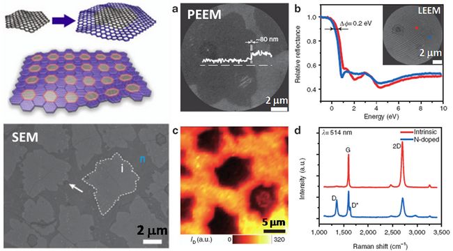 近日,我所纳米与界面催化研究组(502组)与北京大学化学与分子工程学院刘忠范-彭海琳课题组合作,利用本组新近研制的深紫外激光光电子发射显微镜(DUV-PEEM)和像差矫正低能电子显微镜(AC-LEEM)系统对调制搀杂制备的具有“马赛克”结构石墨烯进行表面形貌和表面功函数研究,证实了利用化学气相沉积法成功地实现了本征石墨烯区域和氮搀杂石墨烯区域的可控生长。该工作最近发表于《自然》子刊《自然-通讯》 (Nature Commun. 2012, 3: 1280; doi: 10.1038/ncomms2286)。