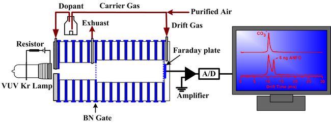 我所李海洋研究员领导的科研团队(102组)基于商品化的VUV灯,研制成功了一种用掺杂剂增强的高效新型VUV负离子电离源。将该电离源与离子迁移谱结合,对痕量爆炸物进行了分析检测。实验结果表明:对典型的民用炸药硝铵(ANFO)、军用炸药三硝基甲苯(TNT)和吉纳(DINA)的检测限分别达到10 pg, 80 pg和100 pg。利用飞行时间质谱对试剂离子归属结果显示,首次发现CO3-(H2O)n是主要试剂离子,这与63Ni源不同(主要是O2-(H2O)n)。利用该试剂离子与硝铵、三硝基甲苯和吉纳反应,实现了样品离子峰与试剂离子峰的更好分离,减少了误报发生;另外,CO3-(H2O)n可以与爆炸物直接结合,从而提高电离效率。该结果已在线发表在美国化学会Analytical Chemistry(http://pubs.acs.org/doi/abs/10.1021/ac302836f)。