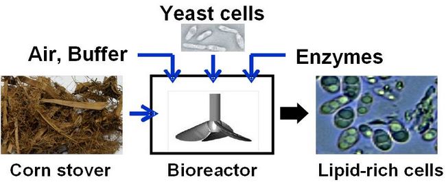 将木质纤维素资源转化为油脂及液体生物燃料,对节能减排和社会经济可持续发展具有重要战略意义,但目前尚面临原料利用率低、转化过程复杂、效率低等共性关键问题。我所生物质高效转化研究组(1816组)在赵宗保研究员带领下,以生物质制油脂和生物柴油为目标,开展了系统研究,最近在生物能源领域重要学术刊物Biotechnology for Biofuels上发表了一种同步糖化强化油脂发酵(simultaneous saccharification and enhanced lipid production)的新策略。该策略利用纤维素或处理过的生物质原料、水解酶和足量产油酵母的混合体系,直接将纤维质原料转化为油脂。利用纤维素和处理过的玉米秸秆为原料时,油脂质量得率分别达到20.4%和11.2%,在摇瓶培养条件下油脂生产强度达到0.13 g/l/h。该微生物油脂主要包含碳链长度为16和18的脂肪酸,适合用于制造生物柴油及相关油脂化工产品。