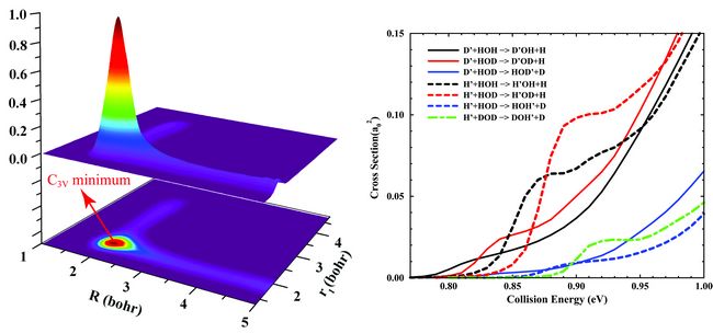 该文章是此研究小组继H原子和水分子交换反应研究(Chemical Science, 3, 270 (2012))后再次受到国际同行高度认可的工作。该工作首次用全维的含时波包方法计算得到了一个四原子交换反应精确的积分截面,并在积分截面随碰撞能变化的曲线上,发现了一个明显的台阶。经分析发现,此交换反应的反应途径上有一个比较浅的势阱,它能支持几个形貌共振(Shape Resonance)态,又因为基态共振态寿命较长,从而能在积分截面上形成一个明显的台阶。化学反应中的Shape Resonance 共振信号,是该研究小组首次通过精确的理论计算发现的,该结果为实验发现 Shape Resonance提供了很好的预测。此研究进一步发现,由于D原子的隧道贯穿(Tunneling)能力比H原子弱,因此来源于Tunneling 的Shape Resonance信号在D原子和水分子的交换应中减弱很多,主要体现在计算得到的积分截面曲线上的台阶不那么明显了。这些精确的理论计算为理论上进一步在态态层次上研究此交换反应,以及实验上探测Shape Resonance 信号提供了一个很好的研究基础。(文/图 傅碧娜)
