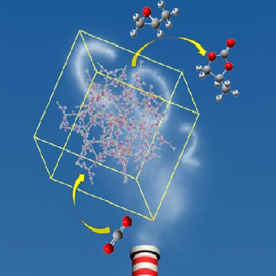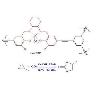 这种材料主要是将催化中心(salen-金属)镶嵌入共轭微孔高分子骨架制得。其表面积高达700-1000平方米每克,在常温常压下1g聚合物可吸附70-80毫克CO2,媲美于金属框架化合物(MOF)。在常温常压下即能催化CO2与环氧丙烷反应,48小时后可达81%的产率,100%的选择性,循环使用寿命长。其催化性能远远高于现在工业上采用的催化剂,是目前唯一能在常温常压下催化该反应的异相催化剂。理论计算得到的催化机理表明,该反应在这种材料作用下最高活化能仅为9kcal/mol,因此在常温常压下就可以进行。这种材料的成功制备为CO2减排带来一个新思路,该成果的扩大化将在CO2的利用上具有良好的应用前景。