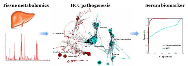 研究者基于超高效液相色谱-高分辨质谱分析平台,对50例肝癌患者的癌组织、癌旁近端组织和远端组织进行了非靶标代谢谱分析,结合多变量数据处理方法和生物信息学技术,从整体层面阐明了肝癌微环境的代谢紊乱状况。研究结果表明肝癌患者出现了大量的代谢异常,主要包括糖酵解加速,三羧酸循环抑制,糖异生和β-氧化加快以进一步提供能量,脂肪酸代谢相关的Δ-12脱氢酶活性显著下调。此外,谷胱甘肽等抗氧化分子水平增高,炎症相关的多不饱和脂肪酸和磷脂酶A2水平下降。将组织中发现的差异代谢物在298例慢性肝炎、肝硬化和肝癌病人血清样本中检测,发现甜菜碱和丙酰肉碱联合对原发性肝癌有良好的诊断能力。通过另一批血清样本的外部验证,进一步证实了上述两种代谢物在肝癌中的诊断潜力,与肝癌标志物甲胎蛋白有很好的互补性。