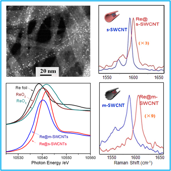 最近,该研究组成功地实现了在管径小至1.5纳米左右的单壁碳管内高效组装限域催化剂,并利用原位X-射线吸收光谱和拉曼光谱,分别跟踪反应过程中金属和碳管的电子结构变化,特别是通过单根碳管的实验,验证了上述预测:即碳管自身的电子结构直接决定着其对催化反应性能的调变作用。尽管金属性和半导体性碳管限域体系的形貌特征非常相似,但由于金属团簇与管壁之间的电子相互作用导致限域金属的化学态迥然不同。这一研究结果不仅提供了限域体系主客体电子相互作用的直接实验证据,而且为一系列氧化还原反应设计高活性的金属团簇催化剂提供了新思路,也为可逆调变碳管电子结构而不破坏其管壁提供了一条新途径。