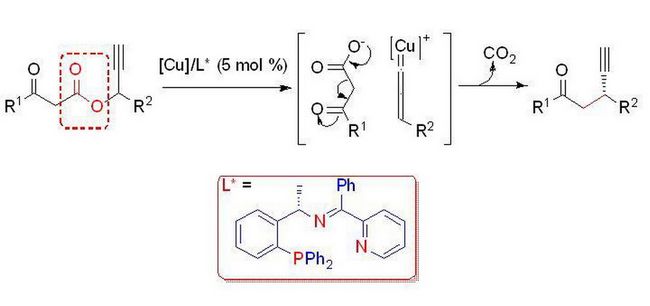 近日,我所功能有机分子与材料研究组(02T2组)胡向平研究员等利用自主发展的一类新型酮亚胺三齿P,N,N-配体,首次实现了铜催化的分子内不对称脱羧炔丙基烷基化反应。反应在手性铜催化剂的作用下,通过脱去酮酸炔丙醇酯底物内的一分子CO2,原位生成了烯醇碳负离子和亚丙二烯基铜金属配合物离子对。该反应条件温和,对映选择性高,为解决催化不对称炔丙基取代反应研究中的一些挑战性问题提供了一种新思路。相关研究结果以通讯形式在线发表在Angew. Chem. Int. Ed.(doi/10.1002/anie.201309182)上。
