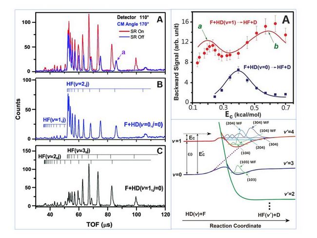 利用该实验技术,他们对F+HD(v=1)反应进行研究。F+H2/HD是经典的放热三原子反应,2006年杨学明、张东辉等人在F+H2反应中观察到反应共振态(Science 311, 1440, (2006)), 2010年,他们又在F+HD反应中观察到分波共振态(Science 327, 1501 (2010)),这些共振态都是在产物HF(v’=3)的绝热振动曲线上形成的。对于F+HD(v=1)反应,实验发现在后向散射信号随碰撞能的变化曲线上存在振动现象。为解释实验发现,张东辉等人进一步提高了他们在2008年所拟合的F+H2体系势能面的精度。在新的势能面上,理论与实验取得了高度吻合。理论研究证实实验所观察到的振动现象是由束缚在产物HF(v’=4) 绝热振动曲线上的两个共振态所引起的。更有意义的是,研究发现HF(v’=4) 绝热振动曲线在反应物端与HD(v=1)态相关联,因而它们只能通过HD的振动激发来探测,而不能通过平动能的增加而进入。这项工作表明,对于化学反应,分子振动激发不仅提供能量,也能开启新的反应通道,使我们能观察到在基态反应中所无法观察到的共振现象,对提高我们对化学反应本质机理的认识有着非常重要的意义。(文/肖春雷 图/汪涛)