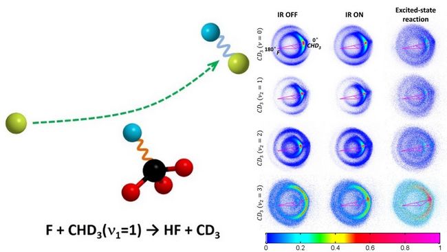 在化学反应中,不同自由度的能量对于化学反应的驱动能力不同。反应物不同振动模式的激发对于化学反应的反应性和动力学影响的研究是选键化学和化学反应控制的热点之一。通常情况下,增加初始反应物的能量会一定程度地促进化学反应的发生。但是,对于F+CHD3这一反应体系而言,反应物CHD3中C-H键的振动激发却抑制了C-H键的断裂。为了更加深入的理解这个有趣的动力学过程,就必须开展详细的、定量的动力学研究。然而,从实验上获得振动激发态反应定量的动力学信息是一项富有挑战性的工作。