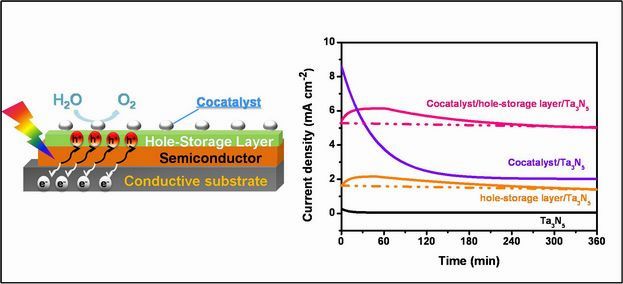 为了提高太阳能制氢效率,需要发展宽光谱捕光的窄带隙半导体光阳极,其中具有代表性的窄带隙半导体Ta3N5材料,其太阳能制氢理论效率可达15% 以上,是目前国际太阳能光电催化制氢领域的主攻体系之一。但该体系易受光腐蚀,解决其稳定性是本领域的挑战课题。在这项工作中,在光阳极表面组装ferrihydrite (Fh) 层,在保持光电催化水氧化高效率前提下,发现其稳定性可由几分钟提高到数小时,甚至工作十余小时后也未见明显衰退,这是目前世界上报道的最高稳定性的Ta3N5分解水光阳极体系。研究发现Ta3N5表面ferrihydrite (Fh) 层具有电容的空穴储存能力,它可将Ta3N5中光激发形成的光生空穴快速转移、高效储存,使半导体免于光腐蚀氧化,从而数量级提高了光阳极的稳定性。在国际上提出了光电催化“空穴储存层”的概念,这为进一步设计构筑高效稳定的太阳能转化体系提供了新的思路和策略。
