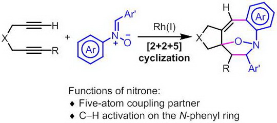 不饱和含氮化合物参与的环加成或环化反应是构建杂环化合物非常有效的手段之一。硝酮化合物(nitrone)作为一种重要的不饱和化合物在环加成反应研究中占有非常重要的地位, 其在生物碱和相关天然化合物合成中的应用也越来越广泛,引起了有机合成化学家的浓厚兴趣。但迄今为止,硝酮通常作为三原子合成子参与不同的环加成反应,用于构建五元、六元或七元杂环化合物。万伯顺团队继吡啶化合物(Angew. Chem. Int. Ed. 2011, 50, 7162-7166)和吡咯化合物(Angew. Chem. Int. Ed. 2012, 51, 1693-1697)的合成研究工作后,尝试利用硝酮来构建中环杂环化合物。在铑催化剂条件下,炔烃与硝酮发生形式上的[2+2+5]环化反应,构建出氧桥联的八元含氮杂环化合物,所得产物可进一步转化成八元环状氨醇化合物。该工作首次将硝酮作为五原子合成子参与到环加成反应中,并成功实现了其N-芳基上的C-H活化。该研究为深入了解硝酮化学以及进一步构建和发展其它杂环化合物提供了新的思路。