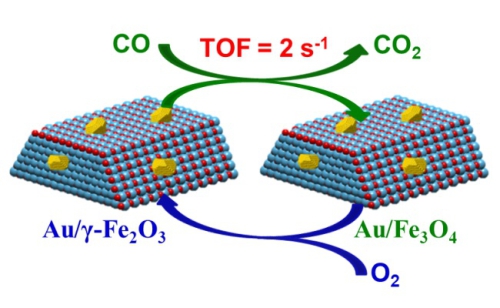 负载型金催化剂对许多重要反应具有独特的高活性和/或高选择性,对于影响负载型金催化剂因素的深入研究不仅能帮助改进催化剂配方进而提高催化剂性能,而且所获得的认识可能对其它负载型贵金属催化剂的制备改进及性能提高具有借鉴与指导作用。该研究组前期研究(Journal of catalysis, 2013, 299, 90-100)中发现铁氧化物负载的金催化剂主要遵从金诱导的氧化还原机理(Redox):具有高氧化还原性能的铁氧化物负载的金催化剂具有更高的催化活性。鉴于此,近日该研究组开发出γ-Fe2O3负载的金催化剂。结果表明,Au/γ-Fe2O3的活性比Au/α-Fe2O3高约20倍,是目前报道活性最高催化剂之一,显示了明显的载体晶相效应(较之于α-Fe2O3,γ-Fe2O3具有与四氧化三铁(Fe3O4)相同的反尖晶石结构,从γ-Fe2O3到Fe3O4的还原只涉及氧原子(O)的流失而不涉及晶格的重排,因此Au/α-Fe2O3催化剂在金诱导下实现了从γ-Fe2O3到Fe3O4的还原低温还原)。