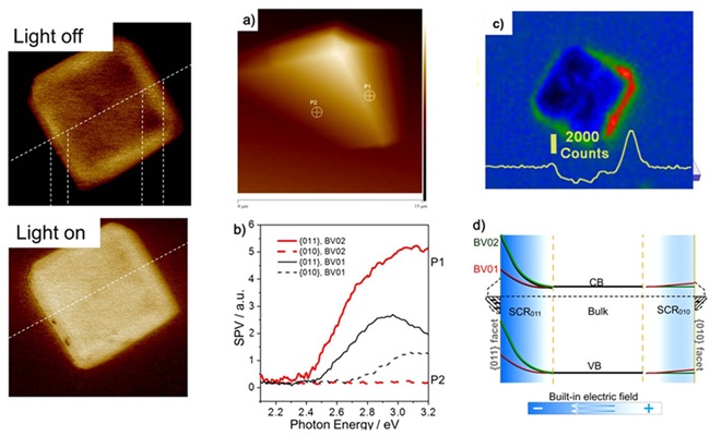 为了更深入地揭示上述体系的关键科学问题——光生电荷分离和迁移的空间特性,该团队自行发展了针对微纳尺度、单个半导体催化剂晶粒表面光生电荷空间分布研究的纳米光电成像系统——空间分辨的表面光电压谱。研究人员利用该仪器观察到BiVO4粒子上不同晶面的表面电势差异。在光激发下,空间分辨表面光电压谱揭示出