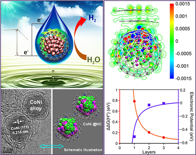 采用廉价和储量丰富的非贵金属替代稀有的贵金属作为催化剂,实现重要能源和化工过程的高效转化是当今催化科学和化学化工研究的热点。近日,我所催化基础国家重点实验室邓德会副研究员和包信和院士带领的研究团队在长期深入研究纳米碳材料催化的基础上,通过创新二维纳米碳材料(类石墨烯材料)的制备策略和合成方法,成功实现了均一的超薄石墨烯壳层(一般为1-3碳层)对3d过渡金属纳米粒子的包裹和封装。理论模拟和实验研究表明,在催化反应过程中,活性金属纳米粒子催化剂在纳米碳空腔中的封装阻断了其与苛刻反应环境(如酸性、碱性和强氧化性等)的直接接触,有效地延缓和阻止了催化剂的失活,同时,被包裹的纳米金属的活性价电子通过与类石墨烯碳层的相互作用“穿透(penetration)”到外表面,实现了高效催化反应。基于这一原理制备得到的石墨烯碳层封装的纳米钴-镍催化剂应用于强酸性条件下电解水制氢反应(HER),表现出了优异的催化活性和稳定性,在电流密度为10 mA/cm2 条件下,电解水阴极过电位仅为142 mV,性能接近于通常采用的40%Pt/C催化剂,相关结果于近日在《德国应用化学》(Angew. Chem. Int. Ed., 2015,DOI: 10.1002/anie.201409524)在线发表,并被该期刊选为“热点文章(Hot Paper)”。