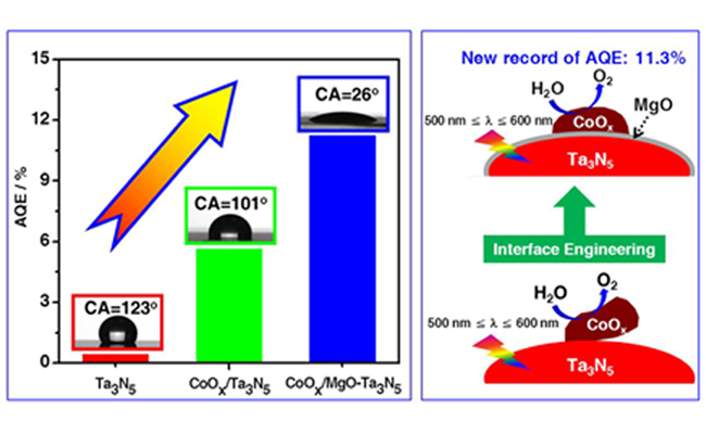 本研究进一步利用MgO纳米层调变宽光谱响应半导体Ta3N5与助催化剂CoOx之间的界面性质,通过改变半导体材料表面的亲疏水性,改善了助催化剂的纳米分散以及界面间电荷的转移,取得了目前宽光谱响应光催化剂上分解水放氧反应的最高量子效率,为发展高效的光催化体系提供了新策略。