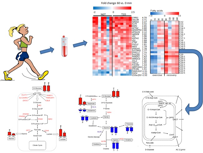 一直以来,人们认可运动对人类健康的好处,尤其是对2型糖尿病预防和治疗的作用。然而,2型糖尿病对运动过程中的燃料供应和氧化的调节及对基因表达的影响尚不明确。在本次的国际合作研究中,研究人员研究了2型糖尿病患者在50%最大摄氧量条件下运动60分钟对代谢组和转录组的影响。结果表明,在运动过程中,2型糖尿病患者葡萄糖和脂肪酸的代谢与正常人雷同,但对骨骼肌中葡萄糖和氨基酸的代谢调节比正常人更为显著。相比正常人,糖尿病患者可以从中等强度的运动中获得更大的好处。研究结果提供了改善2型糖尿病患者血糖和氨基酸代谢新机制的证据。