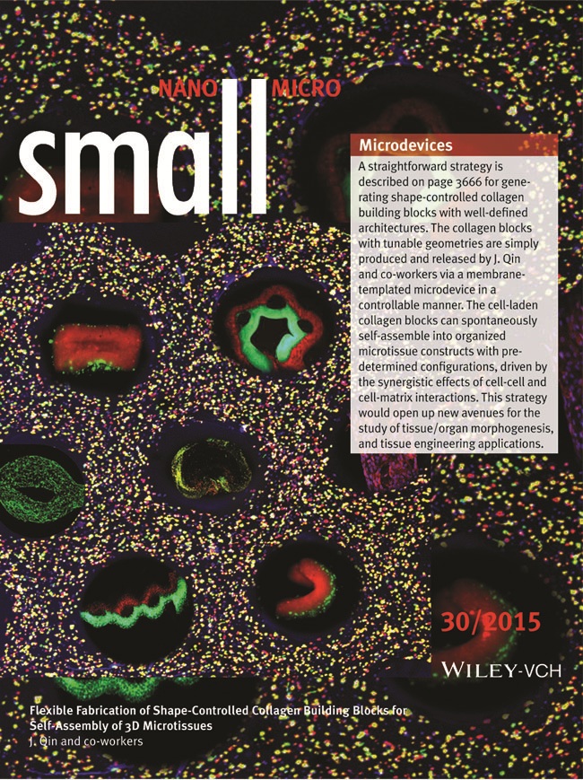 近日,我所秦建华研究员领导的研究团队(1807组)利用微流控技术建立了一种新型 “微流控气动模板法”,用于可控实现具有复杂形貌特点的胶原模块制备与释放,并利用细胞-细胞,细胞-胶原基质间的相互作用,研究了包含有多细胞类型的微组织形成与功能自组装,相关结果作为Frontispiece发表在Small杂志(DOI: 10.1002/smll.201500556),并被Materials View China进行亮点报道。