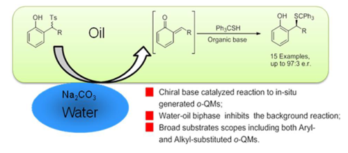 本研究进一步开发水油两相在催化反应中的优势:Ortho-Quinone methides (o-QMs)广泛存在于自然界。在生物身体机制的自我保护过程中,这类中间体起到至关重要的作用;在很多药物对靶点的作用过程中也涉及这类高活性的中间体。这类高活性的中间体在有机合成中被广泛应用,然而有关对o-QMs的手性催化反应研究只有零星的报道,特别是手性碱催化的o-QMs反应研究目前还没有文献报道。分析其主要原因可能是因为o-QMs通常是在碱性条件或酸性条件下原位产生。如果是手性碱催化,则会带来酸碱中和或消旋的背景反应。而我们通过水油两相,实现了水相中无机碱,和油相中的手性无机碱及油溶性底物的空间分离,降低无机碱带来的背景反应,首次实现了碱催化的o-QMs手性催化反应,为基于原位生成o-QMs的手性催化反应提供了新的策略,也为发展水油两相反应提供了新的思路。
