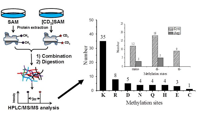 蛋白质甲基化是一种非常重要的翻译后修饰现象,其甲基供体为S-腺苷甲硫氨酸(SAM)。由于甲基化可发生在氨基酸残基的N-, O-和S-中心,并且N-中心甲基化还存在不同状态,同时甲基化对分离行为影响非常细微,限制了对蛋白质甲基化组的解析。常规基于抗体的研究策略仅捕获了部分N-中心甲基化的信息。我所赵宗保研究员和邹汉法研究员提出了“同位素标记SAM甲基化”研究新策略,深入解析了模式生物酿酒酵母的蛋白质甲基化组,首次对蛋白质甲基化实现全覆盖,研究成果最近发表在Journal of Proteomics(2015, 114, 226)上。