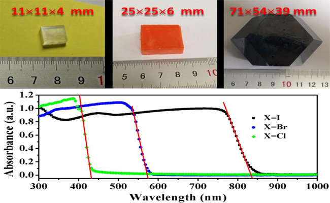 具有钙钛矿晶体结构的甲氨基卤化铅材料,由于具有很高的光吸收系数、很长的载流子传输距离、极少的缺陷态密度等优异性质,成为优异的光伏材料、激光材料和发光材料。目前,经过NREL认证的钙钛矿太阳电池光电转换效率已经达到20.1%,已接近单晶硅太阳能电池的效率。同时,基于钙钛矿材料的激光和发光器件已研发成功,显示出钙钛矿材料在光电领域的广阔应用前景。然而,现在基于微晶或非晶薄膜的钙钛矿太阳能电池及其他光电器件仍然面临的巨大的挑战。微晶钙钛矿薄膜中存在很多晶粒、晶界、孔隙和表面缺陷会造成载流子的复合,是进一步提高太阳能转换效率及其他光电器件性能需要解决的关键问题。基于此,该研究组发展了大尺寸钙钛矿单晶生长方法,并成功制备出尺寸超过70毫米的单晶晶体。通过在室温下进行的高分辨XRD,光学测试,发现CH3NH3PbX(X=Cl, Br, I)钙钛矿晶体材料具有非常高的结晶质量和更好的光吸收范围(相较于薄膜样品),并首次发现CH 3 NH 3 PbCl3材料在402nm处的发光峰。进一步的TGA和DSC表征结果显示出CH3NH3PbI3晶体比薄膜材料具有更高的热稳定性。以上研究结果表明,这种超大尺寸的单晶体CH3NH3PbX3(X = Cl,Br,I)在研发高性能光电器件方面具有很大的潜力。