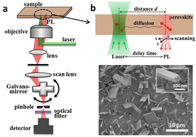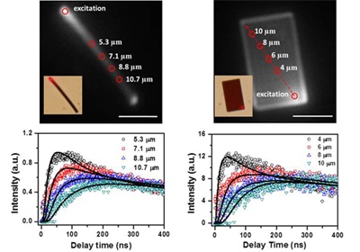 近年来,金属有机钙钛矿材料CH3NH3PbX3(X=Cl, Br, I)由于其在构建高效、廉价太阳能电池和其他光电器件等方面展现出极大的应用价值,成为国际上尤为重要的研究热点材料之一。此类钙钛矿的纳米结构材料(如纳米线和纳米片),在保留优越光物理性质的同时,其微纳尺寸也使得该类材料在微型光电/光学器件等领域具有广泛的应用前景。CH3NH3PbX3类材料在各种器件中的优越表现得益于其独特的光物理性质,如高载流子寿命、高电荷迁移率和长迁移距离。因此对这些光物理参数的定性和定量测定,是人们判断钙钛矿样品质量的重要手段。载流子的寿命可以简单的从载流子荧光寿命的检测中推算,但电荷迁移率(或者迁移系数)的测定往往需要在钙钛矿样品上负载电极材料。然而由于受到样品尺寸的限制,在钙钛矿纳米结构材料(如纳米线、纳米片等,几百纳米到数微米尺寸)上负载电极或者利用传统光谱解析手段(如瞬态吸收显微镜和时间分辨Tera-Hz等)检测则极为困难,这使得人们无从判断钙钛矿纳米结构材料中的电荷迁移性质。该研究组则通过巧妙的构建荧光扫描时间分辨荧光成像系统,在不改变样品形貌的条件下,成功实现了对钙钛矿单晶纳米线和纳米片中光生载流子迁移过程的直接荧光成像。可在观测电荷迁移的动力学过程的同时,获取钙钛矿样品的载流子寿命、电荷迁移常数/迁移率和载流子迁移距离等定量参数信息。