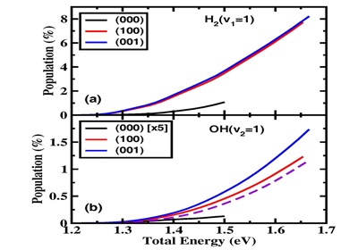 H+H2O→H2+OH及其同位素取代物作为最简单的模式选择反应得到了理论和实验的广泛研究。在固有模式(normal mode)图像中,H2O分子的对称(symmetric)和反对称(asymmetric)伸缩激发态以不同的方式振动,并且两个OH键被同等的激发起来。所以人们通常认为,H2O分子与入射的H原子反应断裂一个OH键之后,剩下的OH会保留振动激发。但是Richard N. Zare等人的实验发现,D2O反对称伸缩基频态(001)和(011)得到的产物OD几乎没有振动激发(J. Phys. Chem. 97, 2204 (1993))。他们提出用局域模式(local mode)图像来解释,然而这个假定从未被理论研究证实。