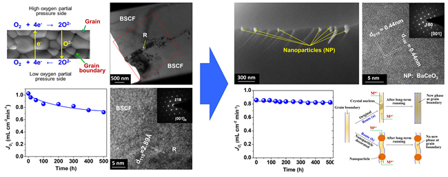 针对上述问题,该研究团队对BSCF透氧膜在操作条件下微结构的变化进行了深入细致研究,发现透氧膜氧渗透通量衰减的主要原因是透氧膜晶界处发生相变造成的;为此提出了将纳米粒子引入透氧膜材料的晶界处以阻止相变的发生,从而抑制氧渗透通量的衰减。当在晶界处引入纳米粒子后,纳米粒子可钉扎晶界,限制金属离子沿晶界的扩散,起到“路障”的作用,从而抑制异相成核与新相的形成。该研究团队进一步从热力学和动力学两个方面论证了该方法的有效性。利用纳米粒子修饰的BSCF透氧膜在550-650°C下,氧渗透通量是其它膜材料通量的10-1000倍;更为重要的是在600°C下运行500h,氧渗透通量未见明显衰减。这种将纳米粒子引入材料晶界处抑制相变的新方法可拓展到其它由晶界诱发的异相成核相变体系。